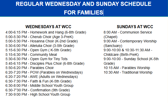 Their time away from WCC allowed them to reflect on who they are, what they truly value, and the gift of great friendships they still had with other WCC families. Covid was an opportunity for them to see the transitions happening in the WCC faith community as a natural evolution of positive change. They both added, “We experienced the changes in worship styles, in leadership, and in ministry areas, and at the same time, we love the familiarity of our church spaces, of Lindy Purdy’s steady presence, of church members who have been here for generations. These are things that make up the core of our church, things that help us feel grounded even as our community evolves and grows. It’s comforting, and amazing!”